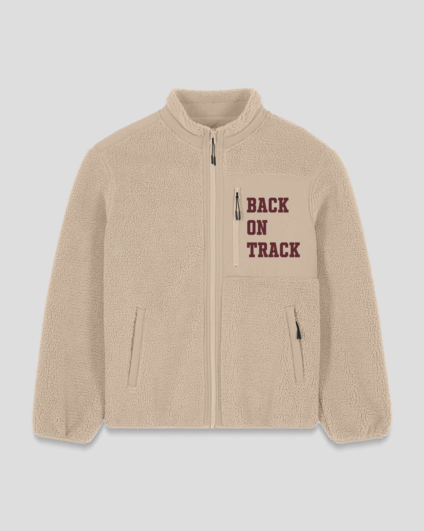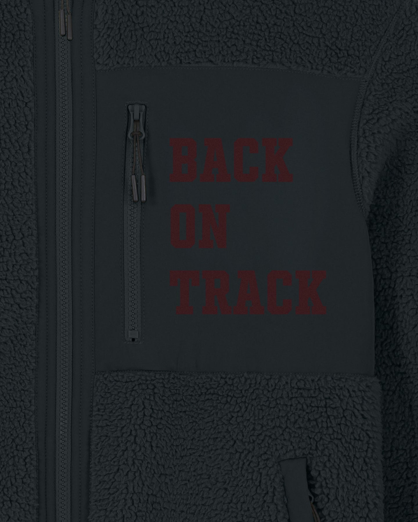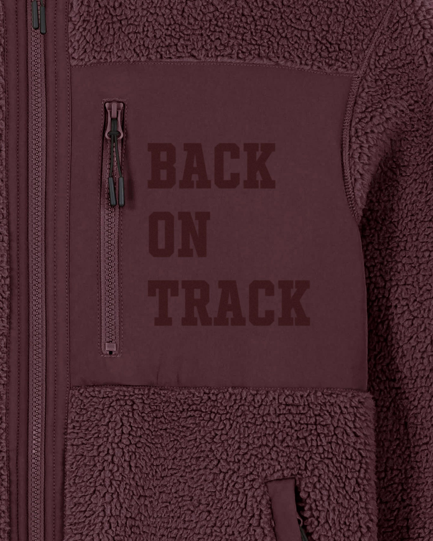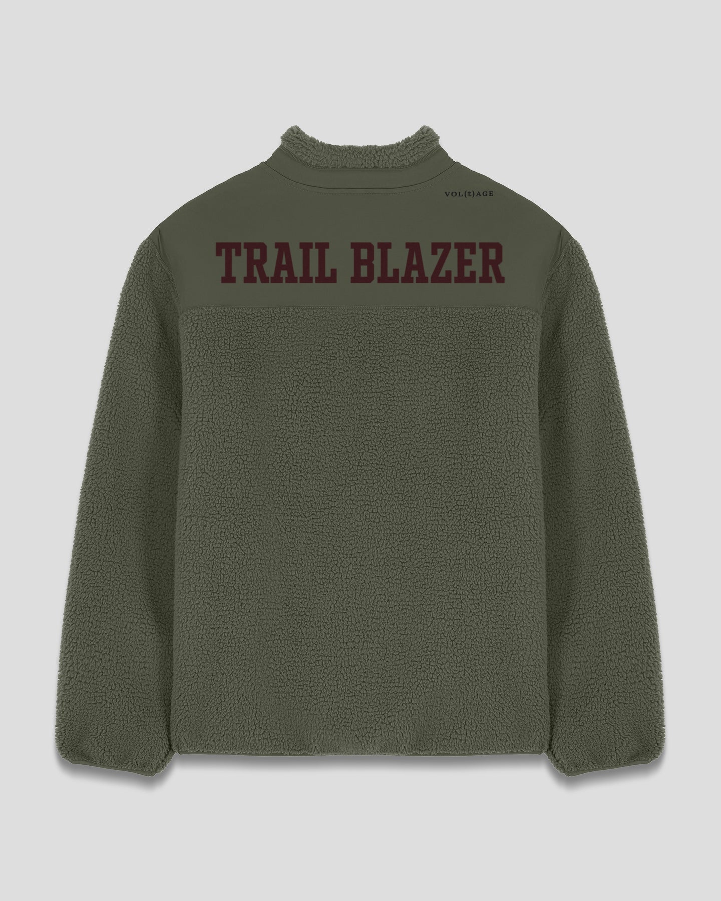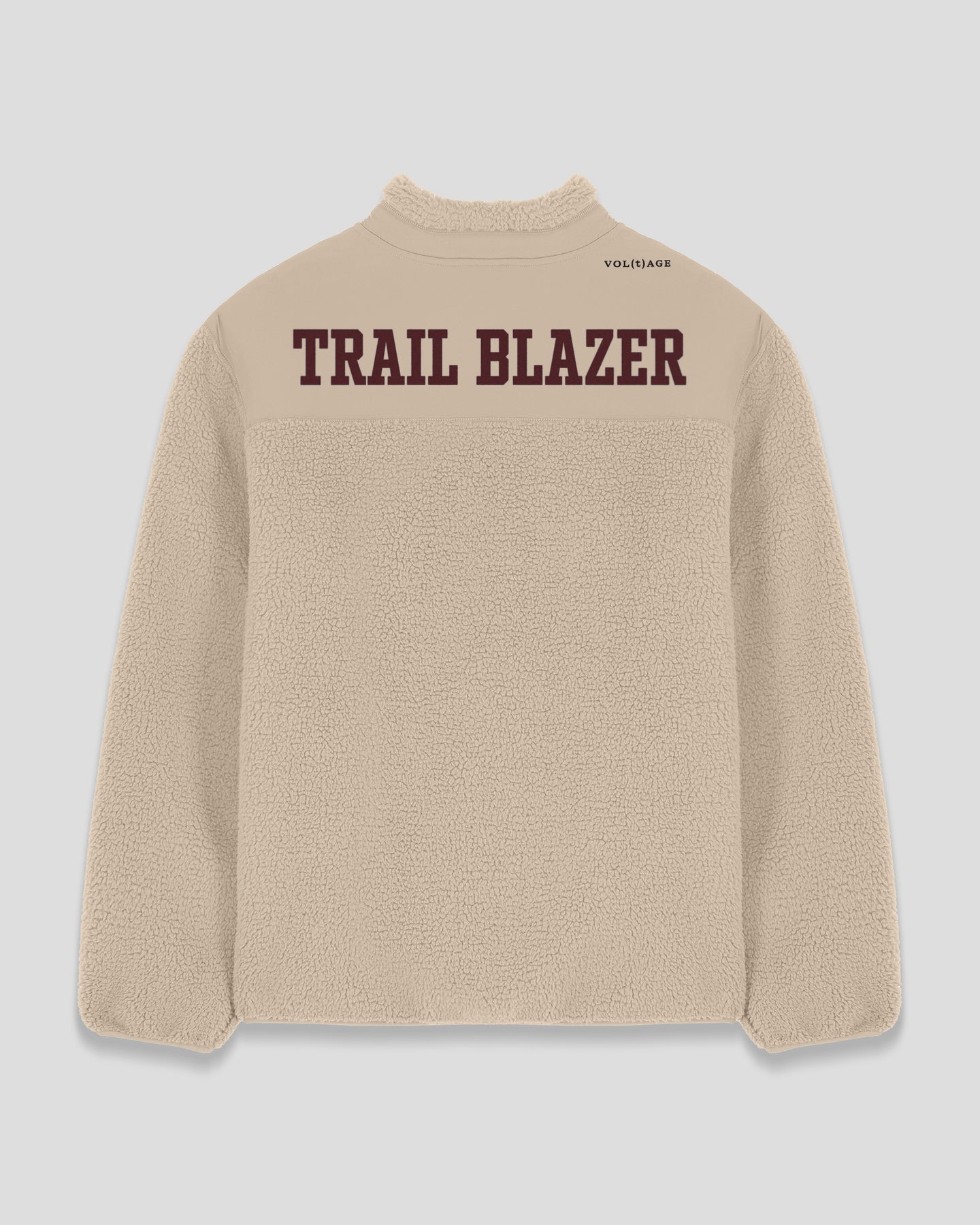 The statement TRAILBLAZER/BACK ON TRACK is printed in burgundy flock.