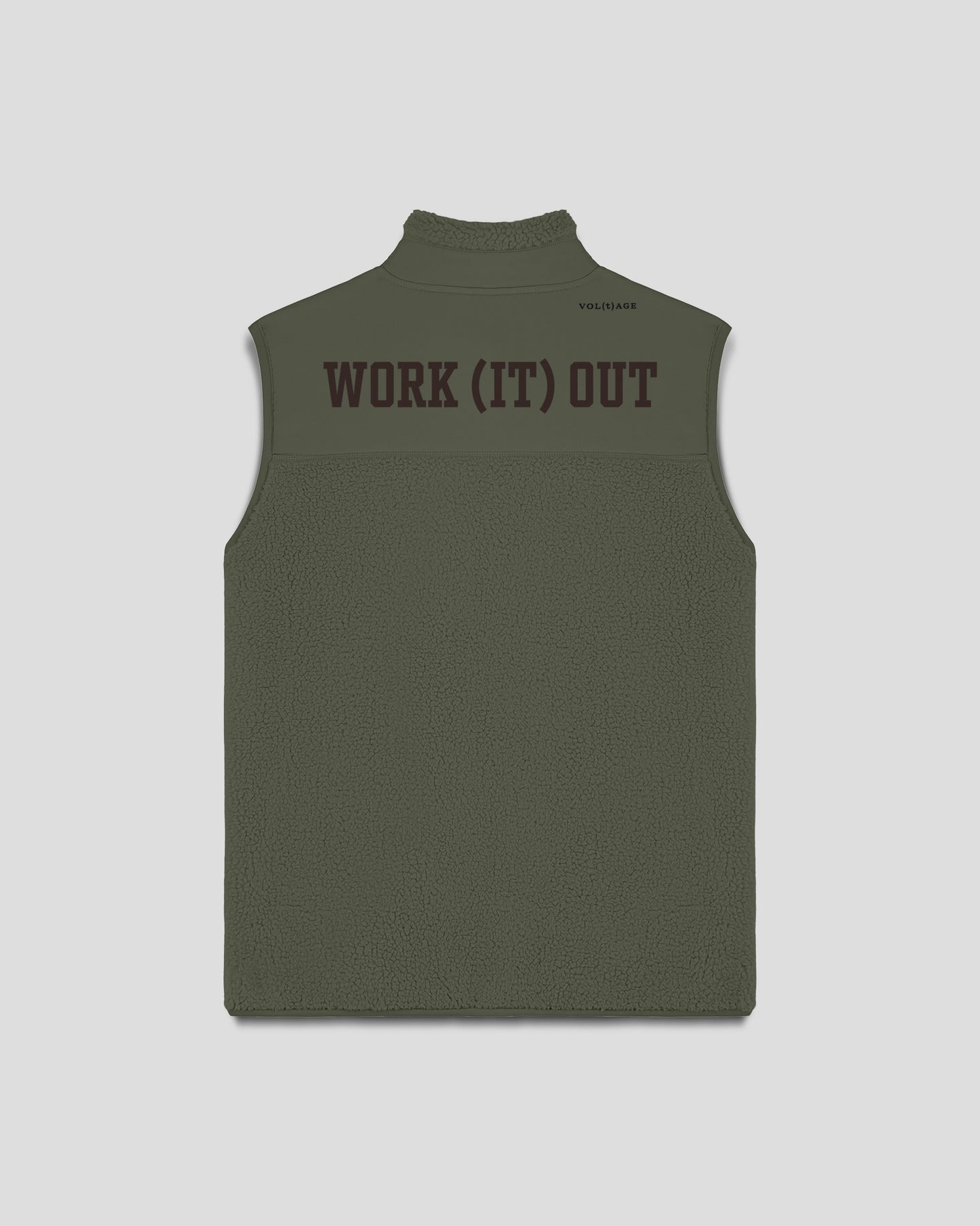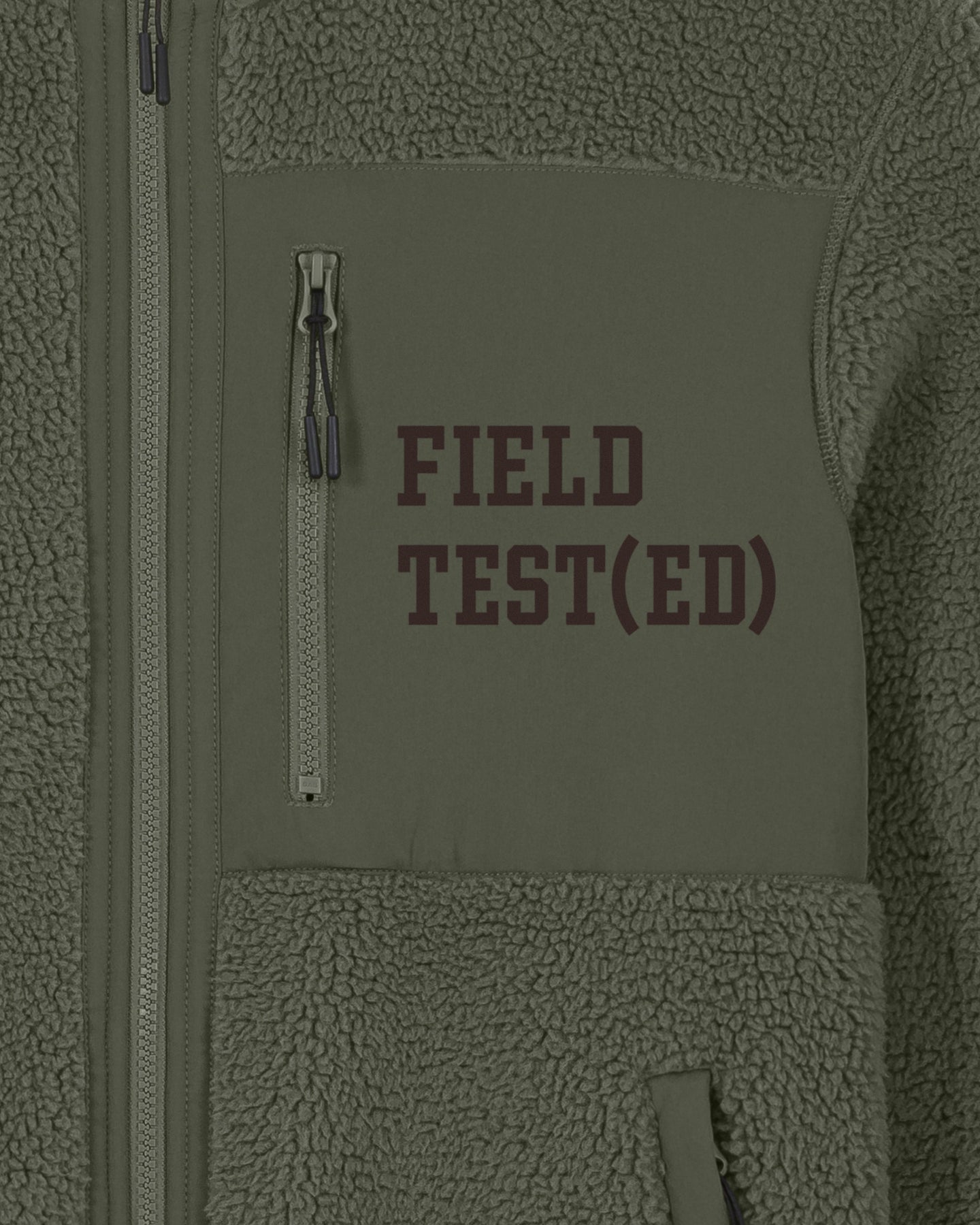 The statement WORK (IT) OUT-FIELD TEST(ED) is printed in chocolate brown flock.