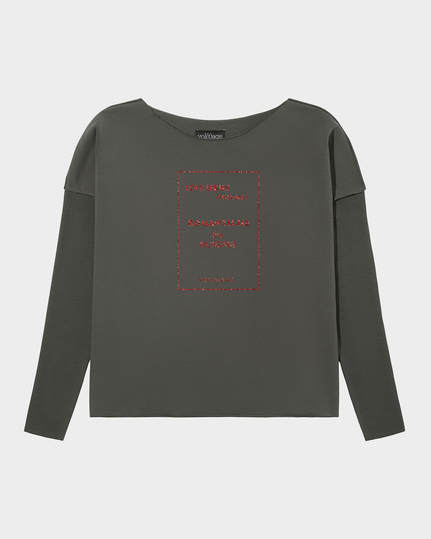 The relaxed smart-shirt is available in 5 colours: black, khaki green, mid grey mélange, navy blue and light grey mélange. The statement is applied in glitter red letters.