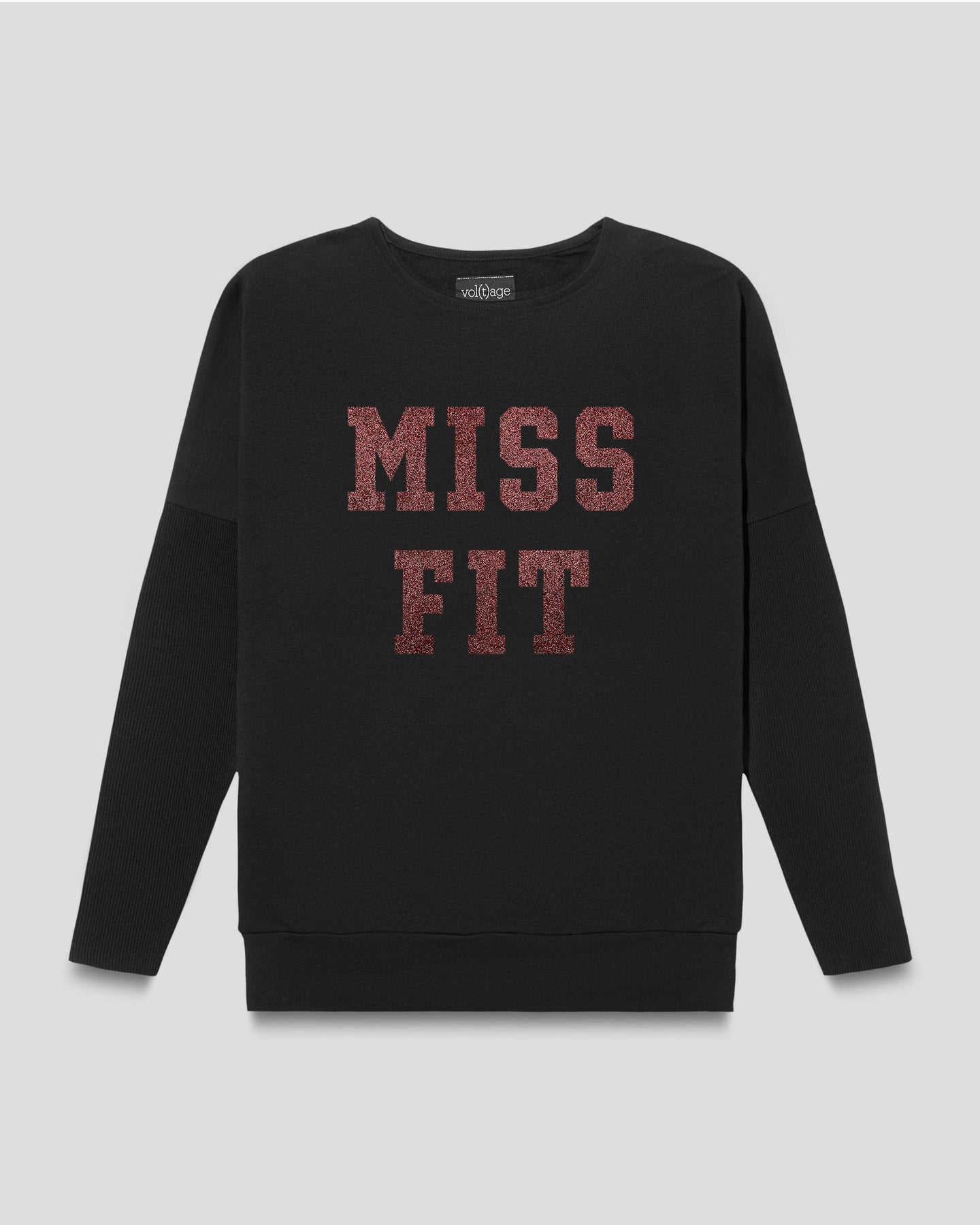 The statement "MISS FIT" is printed in burgundy red glitter.