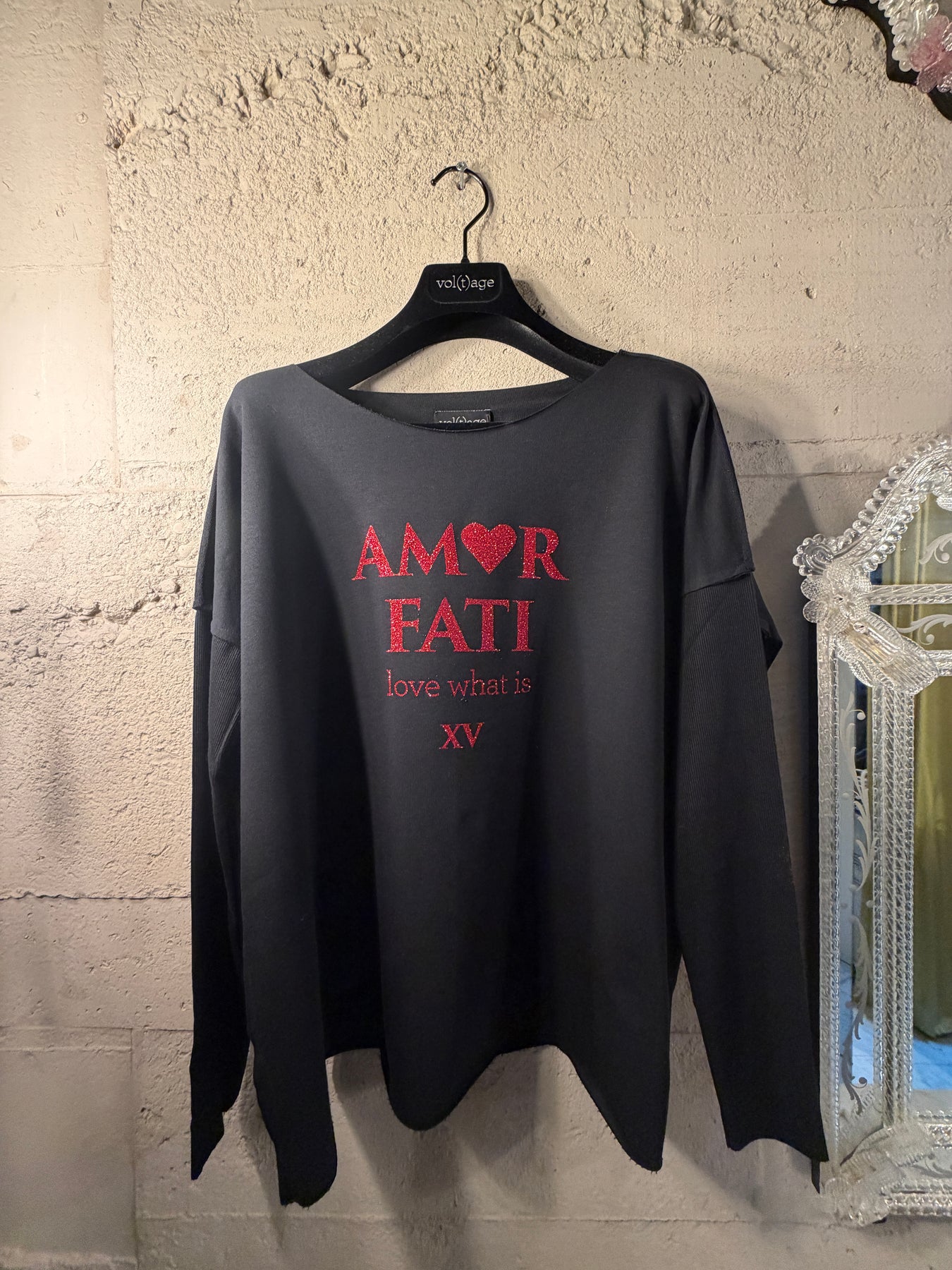 The relaxed smart-shirt is available in 5 colours: black, khaki green, mid grey mélange, navy blue and light grey mélange. The statement AMOR FATI is applied in red glitter.