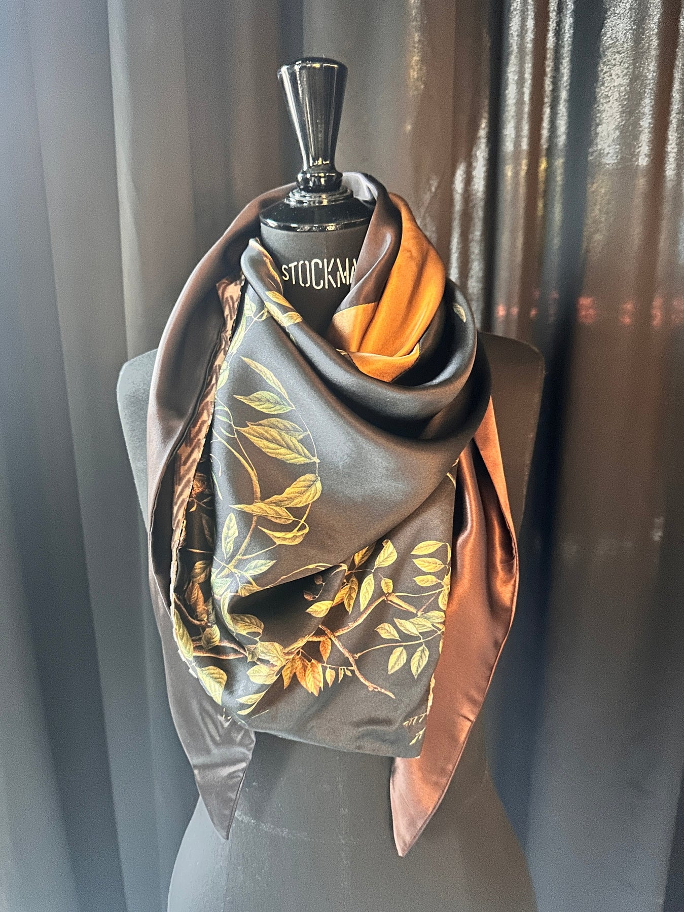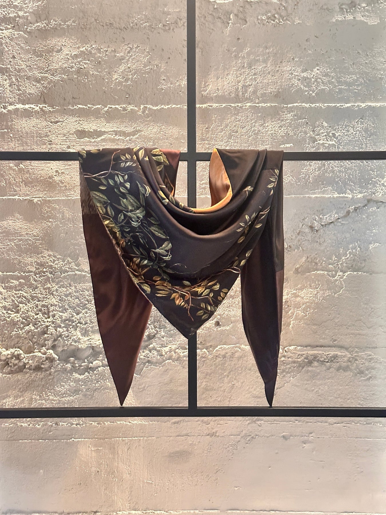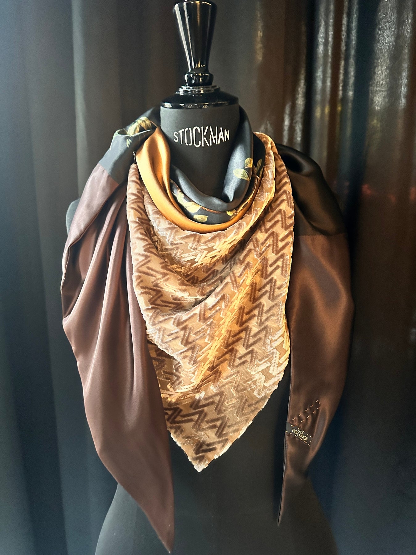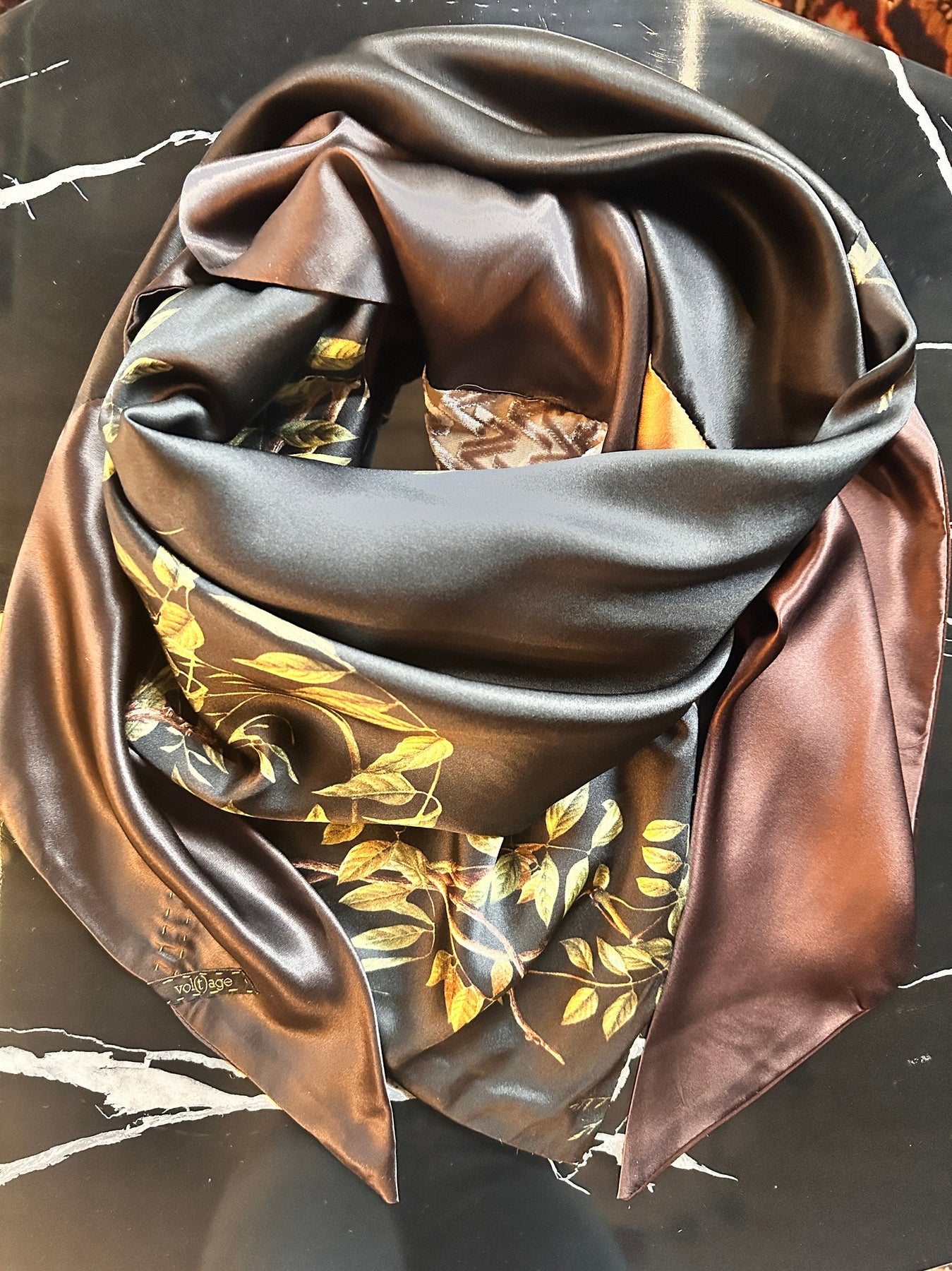 Milk chocolate and dark chocolate silks frame an enchanting hazel-twigs pattern on sumptuous black silk, the scarf is topped off with caramel silk and our signature vv logo dévoré velvet in lush beige.