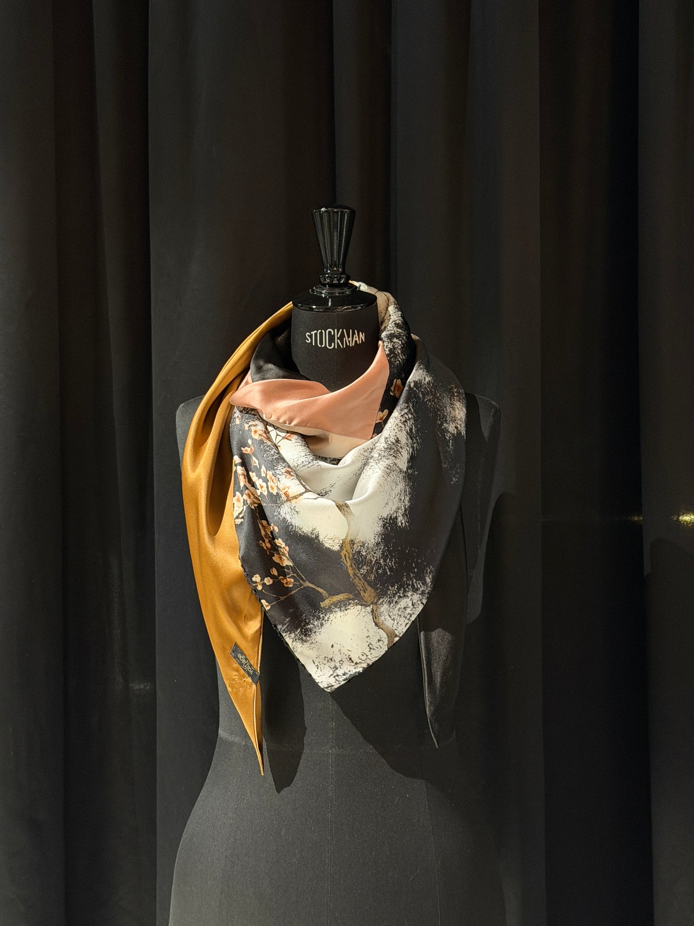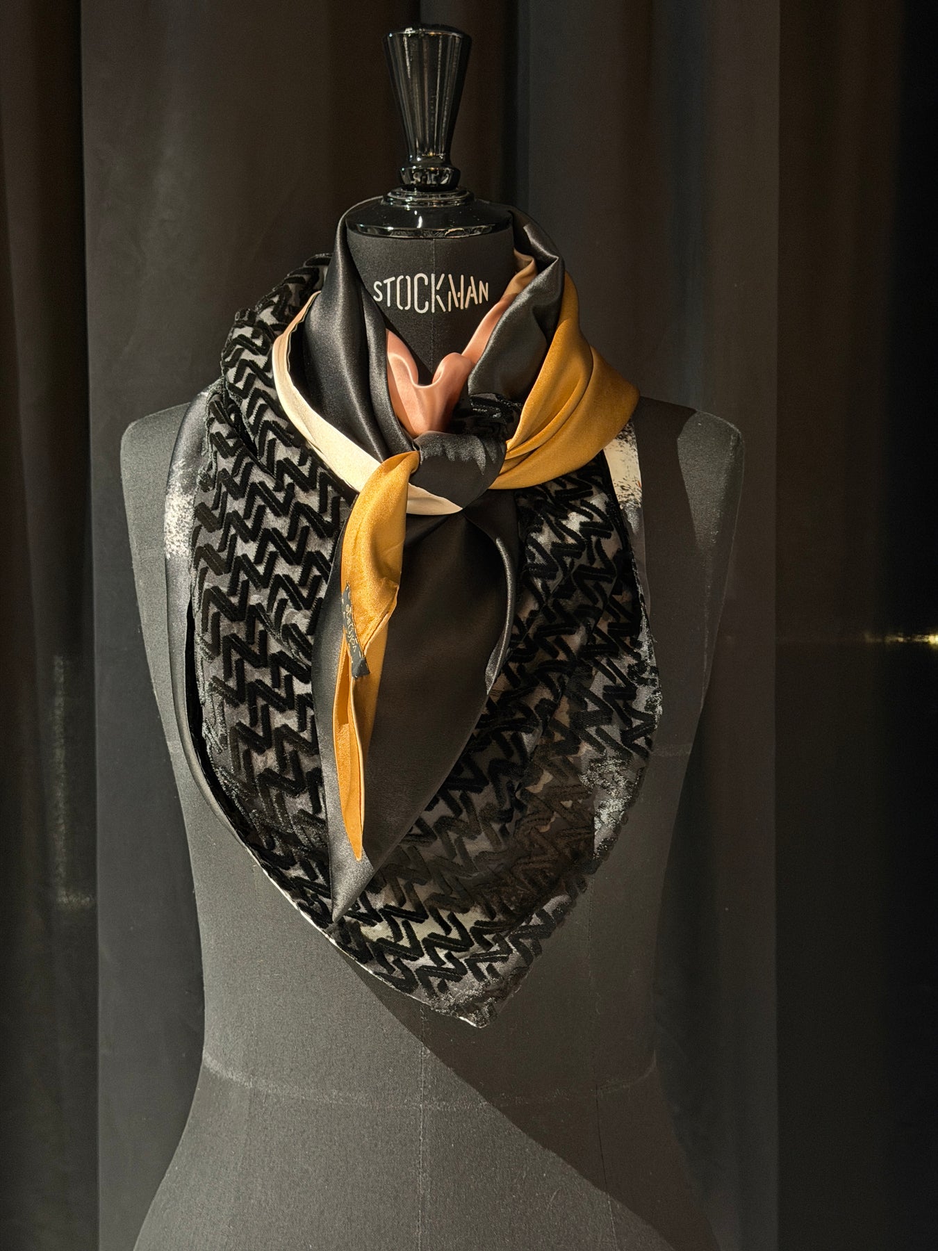 Slightly more compact in size, it hugs the neckline more closely and stays beautifully in place, offering an effortlessly elegant drape with all the impact of our signature silks and devoré velvet. A modern interpretation designed for fluid movement and everyday sophistication.