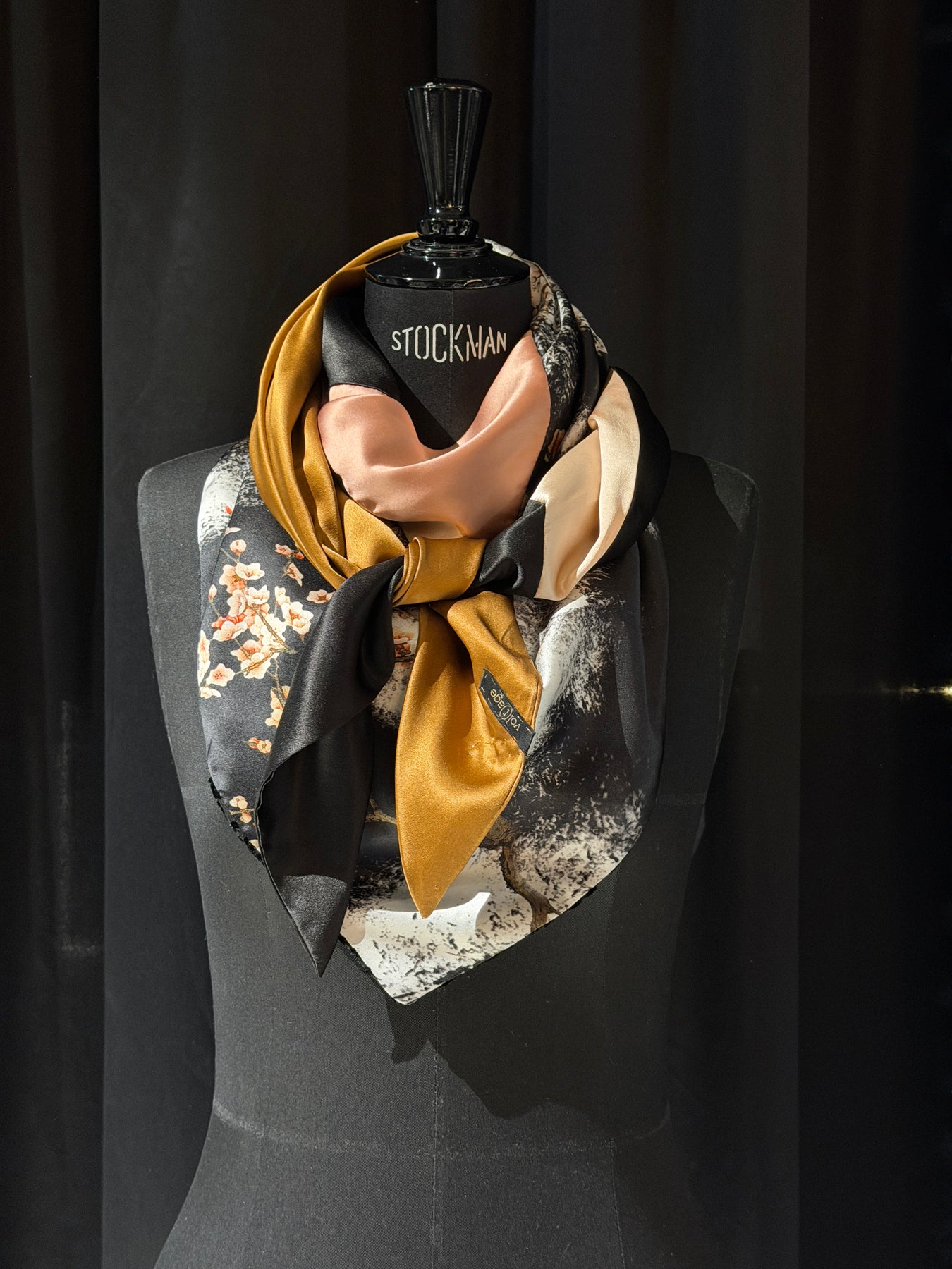 Nude rose, champagne, bronze and black silks unfold against our signature soft black vv devoré velvet, adorned with a delicate cherry blossom motif reminiscent of an enchanted Japanese garden. The palette balances softness and depth- voluptuous without excess, romantic without naïveté.